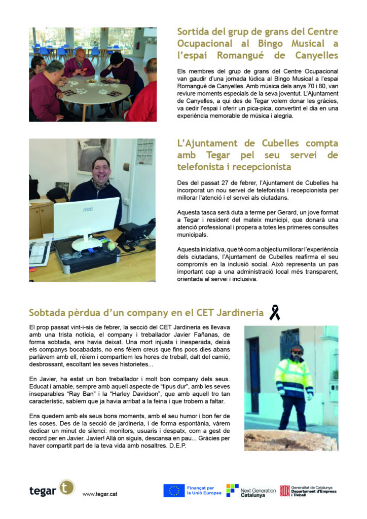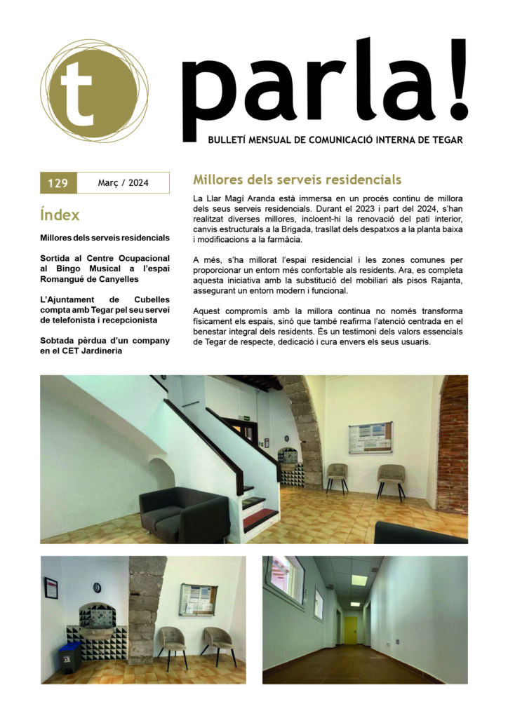 Al Parla!, el butlletí intern de Tegar, aquest mes de març anunciem les millores en els nostres serveis residencials, enfocades a proporcionar un entorn encara més acollidor i de qualitat per als nostres residents. També expliquem la sortida dels membres del Centre Ocupacional al Bingo Musical a l’espai Romangué de Canyelles. Com a notícia que ens il·lusiona tenim la d’haver estat triats per l’Ajuntament de Cubelles per atendre el seu servei de telefonista i recepcionista. Aquest vot de confiança ens impulsa a continuar treballant per a la nostra comunitat.
